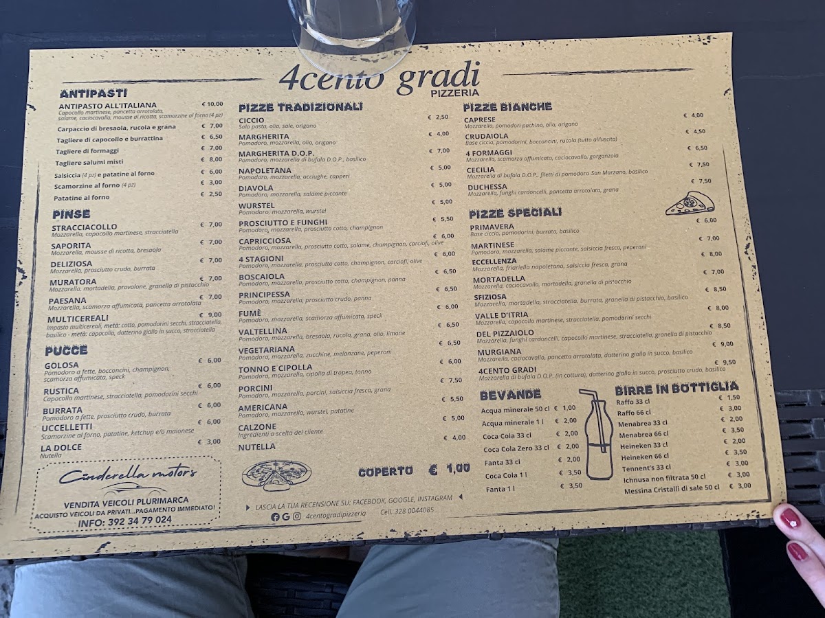 Welcome to 4cento gradi, a gem nestled in the heart of Martina Franca, Italy, known for its exceptional pizzas and warm atmosphere. With a commitment to quality, they serve up some of the finest pizzas in Puglia, featuring excellent dough and top-quality toppings that promise to satisfy any palate.